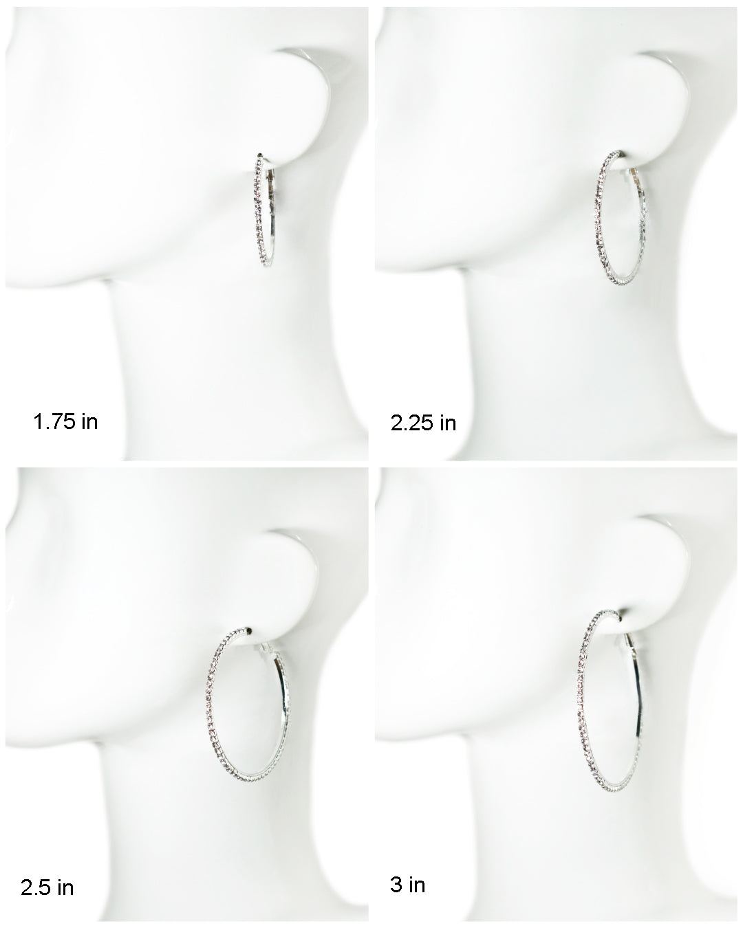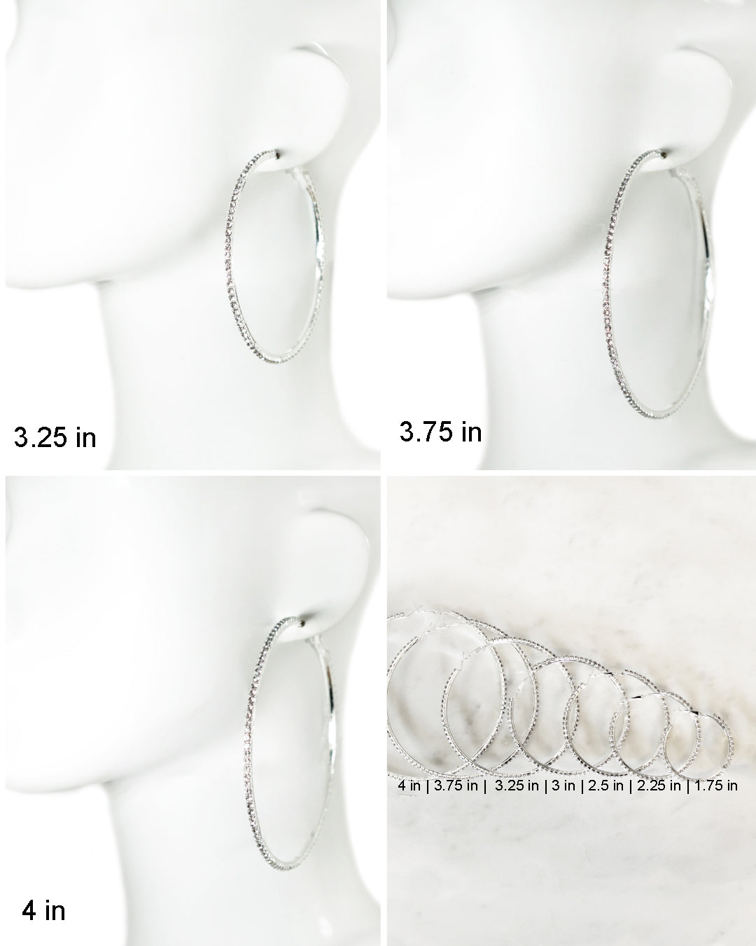 Available in multiple sizes from 1.75 inches to 4 inches, these rhinestone hoop earrings let you choose your perfect statement — from subtle shine to full glam. The secure omega back closure offers comfort and confidence, so you can wear them all day or all night without worry.